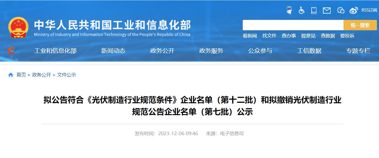 12月6日,工信部發(fā)布擬公告符合《光伏制造行業(yè)規(guī)范條件》企業(yè)名單(第十二批)和擬撤銷光伏制造行業(yè)規(guī)范公告企業(yè)名單(第七批)公示文件。