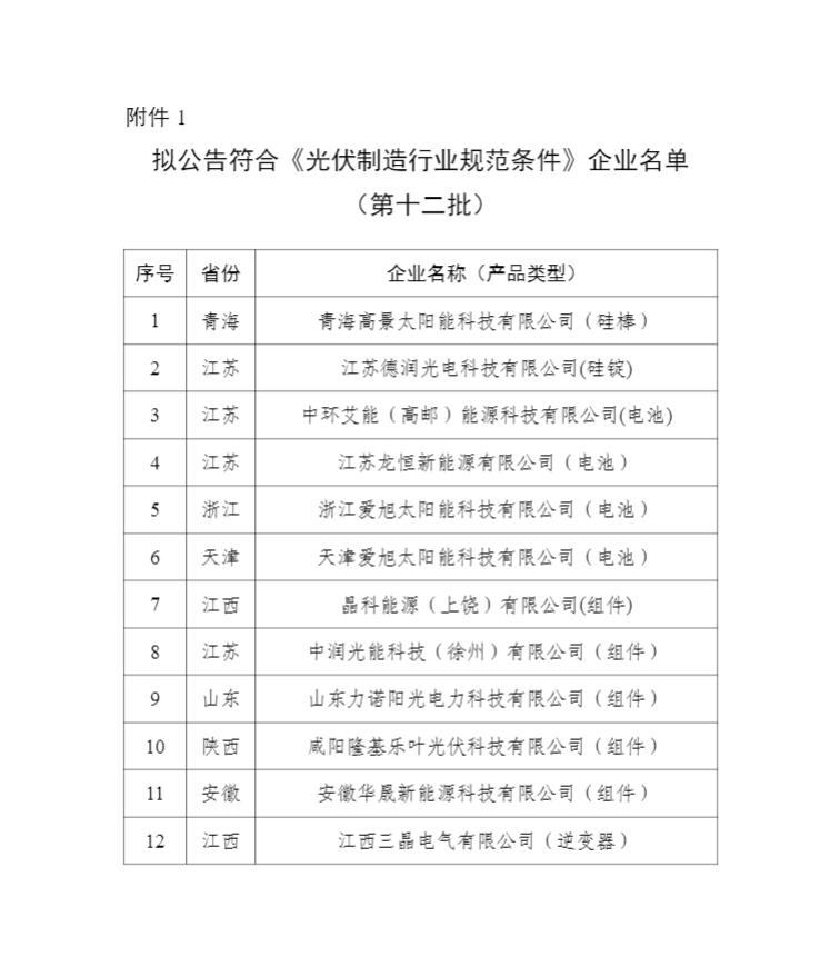 擬公告符合《光伏制造行業(yè)規(guī)范條件》企業(yè)名單(第十二批)