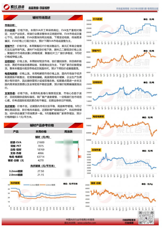 光伏產(chǎn)業(yè)周監(jiān)測報告系索比咨詢對于光伏產(chǎn)業(yè)鏈上下游價格的監(jiān)測與預報,幫助企業(yè)獲得最實時的參考價格。每周除了對硅料、硅片、電池片、組件、輔材等價格進行追蹤和分析外,亦關(guān)注下游招標動態(tài),并對后續(xù)市場趨勢做出研判。