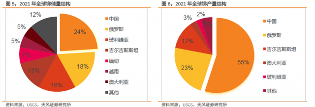 據(jù)USGS數(shù)據(jù),2021年全球銻資源儲(chǔ)備量>200萬(wàn)噸,我國(guó)儲(chǔ)備量最大達(dá)48萬(wàn)噸,占比24%;俄羅斯、玻利維亞、吉爾吉斯斯坦等國(guó)儲(chǔ)量占比靠前。產(chǎn)量方面,2021年全球銻產(chǎn)量約11萬(wàn)噸,我國(guó)是全球第一大銻生產(chǎn)國(guó),產(chǎn)量占比55%(6萬(wàn)噸);俄羅斯和吉爾吉斯斯坦等國(guó)產(chǎn)量靠前。