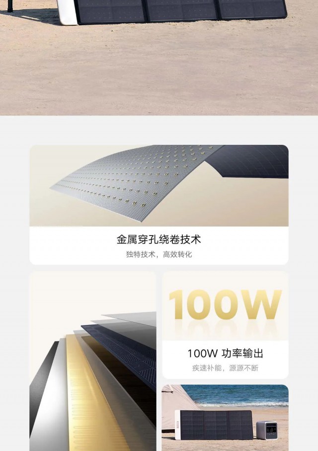 米家太陽能板100W擁有最高100W MAX大功率,可搭配戶外電源進(jìn)行快速補(bǔ)能,同時支持邊曬邊充,戶外有光就有電。