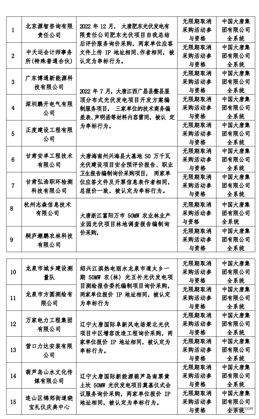 3月1日,大唐集團發(fā)布2023年第2批關于供應商不良行為處理情況的公告,共有699家企業(yè)被點名。其中,包含12個光伏項目招標相關的26家供應商被點名。