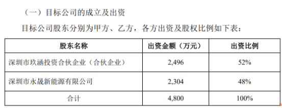 聯(lián)合出資競(jìng)拍,加速布局新能源領(lǐng)域本次公告顯示,深圳永晟與玖涵投資共同成立的合資公司注冊(cè)資本為4800萬(wàn)元,其中玖涵投資以人民幣現(xiàn)金出資2496萬(wàn)元,占注冊(cè)資本的52%;深圳永晟以人民幣現(xiàn)金出資2304萬(wàn)元,占注冊(cè)資本的48%。