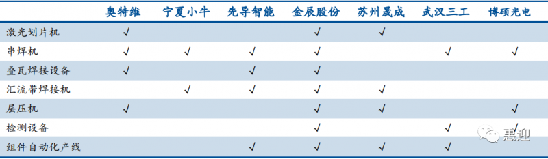 組件設(shè)備的市場(chǎng)較為分散,公司數(shù)量較多,競(jìng)爭(zhēng)較為充分。組件設(shè)備國(guó)產(chǎn)化進(jìn)程較早,廠商可提供多種產(chǎn)品,充分利用技術(shù)同源和客戶同源優(yōu)勢(shì)。如奧特維可提供激光劃片機(jī)、串焊機(jī)、疊瓦串焊機(jī)、層壓機(jī)等設(shè)備,先導(dǎo)智能可提供串焊機(jī)、疊瓦一體焊接機(jī)、匯流條焊接機(jī)等設(shè)備,金辰股份可提供激光劃片機(jī)、串焊機(jī)、疊片焊接機(jī)、層壓機(jī)、匯流條焊接機(jī)、層壓機(jī)、EL 測(cè)試儀等設(shè)備。同時(shí),先導(dǎo)智能、金辰股份、蘇州晟成、武漢三工還可提供組件自動(dòng)化生產(chǎn)線。