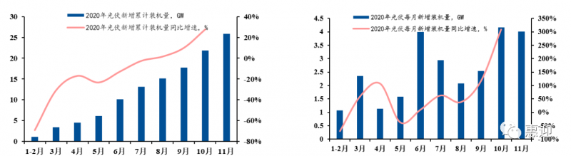 2020 年,我國(guó)新增光伏裝機(jī)量為 48.2GW,同比增長(zhǎng) 81.7%,超過(guò)年內(nèi)各機(jī)構(gòu)預(yù)期。根據(jù)中電聯(lián)的數(shù)據(jù),我國(guó)光伏新增裝機(jī)量已在 2020 年下半年走出疫情的影響,光伏裝機(jī)量從 8 月份恢復(fù)至 19 年同期水平,10 月份新增的累計(jì)裝機(jī)量同比已實(shí)現(xiàn) 20%正增長(zhǎng),單月新增裝機(jī)規(guī)模超過(guò) 4GW,同比增長(zhǎng)率高達(dá)300%。