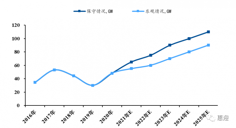 在中國(guó)向“30·60目標(biāo)”邁進(jìn)的過(guò)程中,“十四五”是實(shí)現(xiàn)碳達(dá)峰的關(guān)鍵時(shí)期,光伏發(fā)電大有可為。根據(jù) CPIA的觀察與分析,預(yù)計(jì) 2021 年新增裝機(jī)規(guī)模約為 55GW-65GW,預(yù)計(jì)“十四五”期間,國(guó)內(nèi)年均光伏新增裝機(jī)規(guī)模將達(dá) 70-90GW。由此推算,未來(lái) 5 年,光伏新增總裝機(jī)規(guī)模有望達(dá)到 350-450GW,同比“十三五”期間 210GW 的新增總裝機(jī)規(guī)模有較大幅度提升。