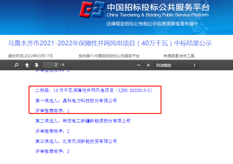 近日,烏魯木齊市2021-2022年保障性并網(wǎng)風(fēng)電項(xiàng)目(40萬(wàn)千瓦)中標(biāo)結(jié)果公示,晶科科技(601778.SH)憑借領(lǐng)先的技術(shù)及良好的行業(yè)口碑,中標(biāo)了其中10萬(wàn)千瓦(100MW)規(guī)模的保障性并網(wǎng)風(fēng)電項(xiàng)目。此次中標(biāo),是晶科科技成立以來(lái)首次獲得風(fēng)電項(xiàng)目,也是公司推動(dòng)可再生、清潔能源開發(fā)利用之路上新的里程碑,標(biāo)志著公司正式進(jìn)軍風(fēng)電市場(chǎng)。