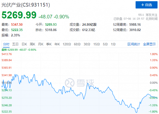 7月6日,光伏板塊迎來分化行情,中證光伏產(chǎn)業(yè)指數(shù)(CSI:931151)早盤在金剛線、組件、逆變器、設(shè)備個股的帶動下創(chuàng)出近期反彈新高,隨后硅料、硅片個股震蕩下跌,拖累指數(shù)盤中跌幅一度達到1.78%。截至收盤,中證光伏產(chǎn)業(yè)指數(shù)報收5270點,跌幅收窄至0.9%。