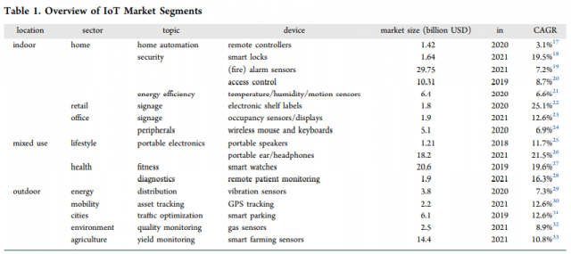雖然物聯(lián)網(wǎng)市場(chǎng)巨大且增長(zhǎng)迅速,但要確定能量收集的最佳應(yīng)用并非易事。用例將定義需要由太陽(yáng)能模塊提供的功率預(yù)算。放置設(shè)備的環(huán)境和產(chǎn)品的外形尺寸定義了可能收集的能量的邊界條件。最重要的是,從業(yè)務(wù)角度來(lái)看,整合應(yīng)該是有意義的,因此需要進(jìn)行仔細(xì)的成本/收益分析,同時(shí)考慮到環(huán)境影響。為了解決這些問(wèn)題,Saule的方法是查看物聯(lián)網(wǎng)應(yīng)用程序中最大和增長(zhǎng)最快的部分,并按位置、部門、設(shè)備類型和價(jià)值主張對(duì)其進(jìn)行分類。表 1 總結(jié)了一些已識(shí)別的機(jī)會(huì)。