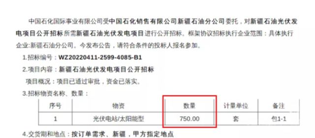 2022年4月1日,中國石化銷售有限公司新疆石油分公司公開招標(biāo)750套新疆石油光伏發(fā)電項(xiàng)目。