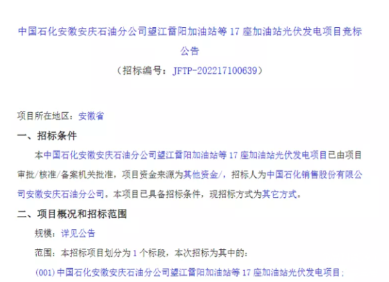 2022年9月28日,中國石化安徽安慶石油分公司望江雷陽加油站等17座加油站光伏發(fā)電項(xiàng)目競標(biāo)公告發(fā)布: