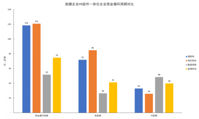 以膠膜業(yè)務(wù)占比較高的福斯特和海優(yōu)新材為例,兩者截至2022Q3的收款期分別為72天和85天,付款期卻僅為33天和26天。受此影響,兩者的現(xiàn)金循環(huán)周期分別高達119天和121天,即使是采取垂直一體化模式的組件廠商也僅在60-80天左右。
