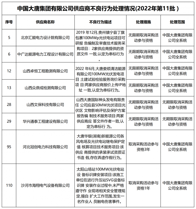 12月13日,中國(guó)大唐集團(tuán)有限公司關(guān)于供應(yīng)商不良行為處理情況的公告 (2022年第12批)公示,對(duì)出現(xiàn)不誠(chéng)信行為、履約不力以及產(chǎn)品質(zhì)量等問(wèn)題的供應(yīng)商進(jìn)行了處理。本批次大唐集團(tuán)共公布受處罰企業(yè)137家,其中,光伏相關(guān)企業(yè)共6家。