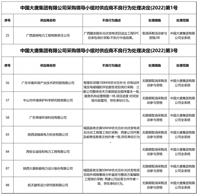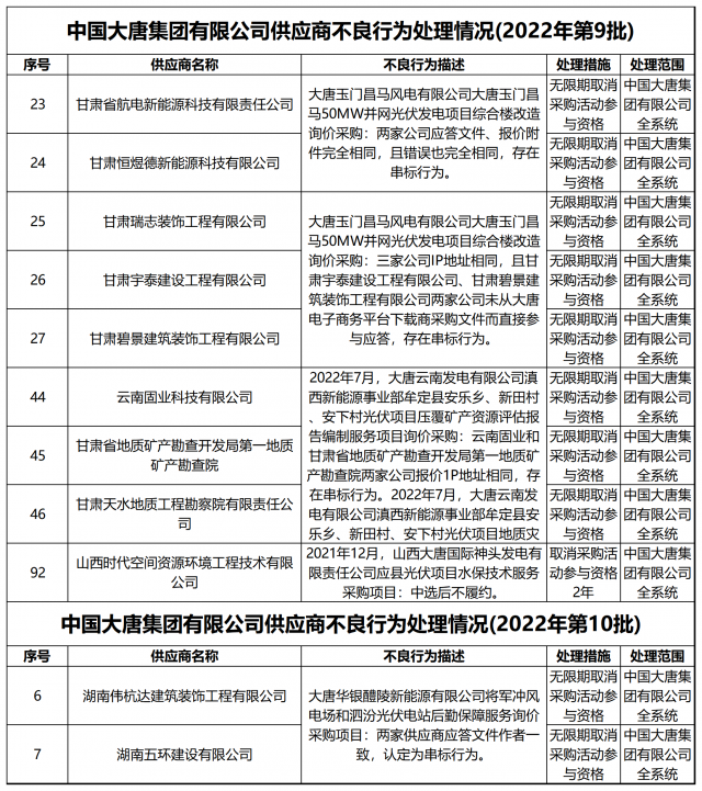 中國(guó)大唐集團(tuán)有限公司關(guān)于供應(yīng)商不良行為處理情況的公告(2022年第12批)