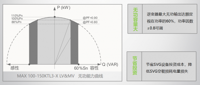 但隨著光伏電站的投運,原來的無功補(bǔ)償裝置的補(bǔ)償容量不夠用,需要額外購買無功補(bǔ)償裝置,這時逆變器可通過監(jiān)測并網(wǎng)點負(fù)載端的功率因數(shù),在發(fā)有功電量的同時,智能調(diào)整功率因數(shù)同時發(fā)一部分無功電量進(jìn)行智能無功補(bǔ)償,這樣可以幫用戶節(jié)省無功補(bǔ)償裝置的費用,也可以減少無功補(bǔ)償裝置空載損耗的電量。