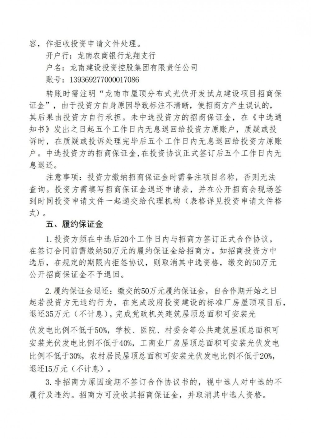 根據(jù)公告,本次招商項目總投資約20億元,首期投資約3億元。建設內(nèi)容為龍南市內(nèi)黨政機關、學校、醫(yī)院、村委會、工業(yè)園區(qū)廠房和農(nóng)村房屋屋頂光伏開發(fā)。通過招商方式引進投資方負責項目建設及運營。龍南建設投資控股集團有限責任公司將可以建設光伏電站的所有屋頂以租賃方式租賃給投資方建設分布式光伏電站,若招商方需要則共同投資,另行約定。投資方負責項目全部投資,包含但不限于建設期間的設計、設備采購、安裝、調(diào)試、驗收等費用以及運營期間的管理、維護等費用。