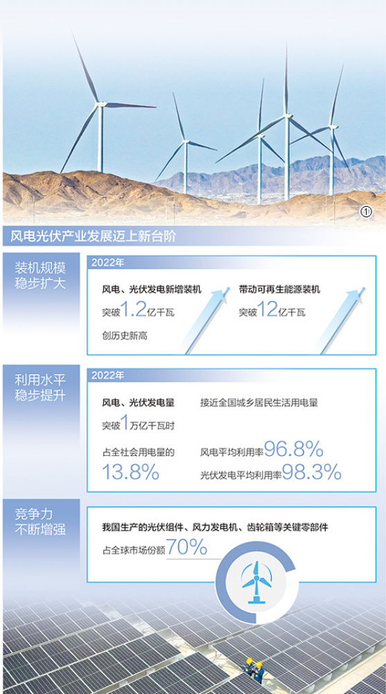 出口總額超過512億美元,同比增長80.3%——2022年,我國光伏產(chǎn)業(yè)在國際市場的表現(xiàn)亮眼。歷經(jīng)多年深耕細(xì)作,我國風(fēng)電光伏產(chǎn)業(yè)競爭力大幅提升,光伏組件、風(fēng)力發(fā)電機(jī)、齒輪箱等關(guān)鍵零部件占全球市場份額的比重提升至70%。在國內(nèi),風(fēng)電光伏也已成為新增發(fā)電裝機(jī)和新增發(fā)電量的主體,2022年占比分別達(dá)到78%和55%以上,累計裝機(jī)突破7億千瓦,相當(dāng)于30多個三峽電站。