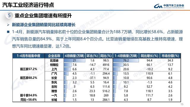 1-4月,國(guó)內(nèi)汽車銷量排名前十位的企業(yè)集團(tuán)銷量合計(jì)為582.2萬(wàn)輛,同比下降3.6%,較1-3月收窄12.7個(gè)百分點(diǎn),占汽車銷售總量的84.8%,低于上年同期1.8個(gè)百分點(diǎn)。在國(guó)產(chǎn)汽車國(guó)內(nèi)銷量排名前十位企業(yè)中,與上年同期相比,比亞迪、北汽、華晨寶馬銷量增速實(shí)現(xiàn)正增長(zhǎng),吉利和一汽銷量增速較1-3月由負(fù)轉(zhuǎn)正,其他企業(yè)呈不同程度下降。