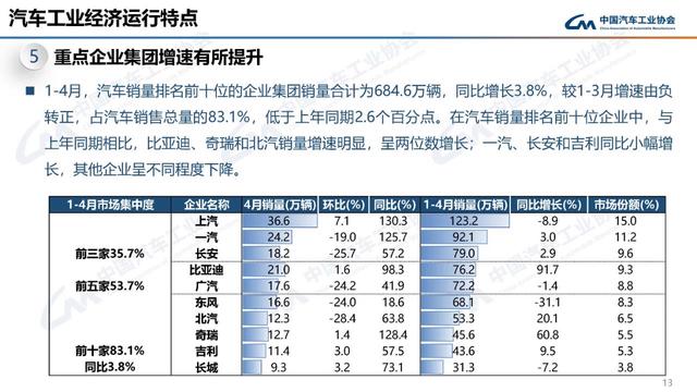 五是重點(diǎn)企業(yè)集團(tuán)增速有所提升。1-4月,汽車銷量排名前十位的企業(yè)集團(tuán)銷量合計(jì)為684.6萬(wàn)輛,同比增長(zhǎng)3.8%,較1-3月增速由負(fù)轉(zhuǎn)正,占汽車銷售總量的83.1%,低于上年同期2.6個(gè)百分點(diǎn)。在汽車銷量排名前十位企業(yè)中,與上年同期相比,比亞迪、奇瑞和北汽銷量增速明顯,呈兩位數(shù)增長(zhǎng),一汽、長(zhǎng)安和吉利同比小幅增長(zhǎng),其他企業(yè)呈不同程度下降。