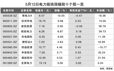 同花順數(shù)據(jù)顯示,5月12日截至收盤,電力板塊指數(shù)漲1.03%,粵電力A、杭州熱電、建投能源3只個(gè)股均漲停,另有皖能電力、華電國際2只個(gè)股均漲超5%,分別為8.87%、6.85%。