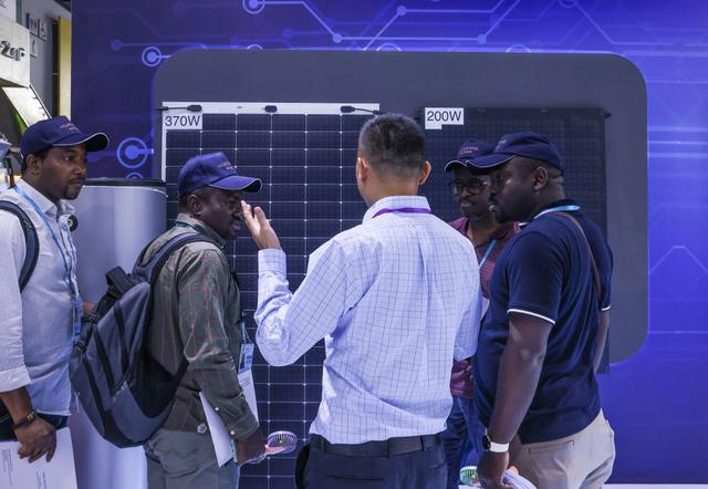 4月15日,參展商在第135屆廣交會(huì)上向采購商介紹太陽能電池組件展品。新華社記者劉大偉攝