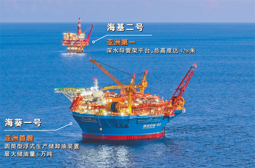 這一天,兩個(gè)“能源重器”——亞洲首艘圓筒型浮式生產(chǎn)儲(chǔ)卸油裝置(FPSO)“??惶?hào)”、亞洲第一深水導(dǎo)管架平臺(tái)“?;?hào)”攜手上崗,標(biāo)志著我國(guó)全類型深水油氣裝備的設(shè)計(jì)、建造和安裝能力達(dá)到世界一流水平。