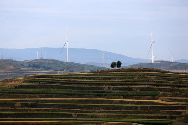夏日時節(jié),在位于黃土高原的甘肅省定西市,風(fēng)電基地風(fēng)機(jī)迎風(fēng)旋轉(zhuǎn),與梯田、村莊相映成景,蔚為壯觀。