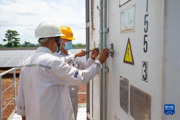 6月2日,在中非共和國首都班吉附近的賓博市,工程師在薩卡伊光伏電站檢修設(shè)備。新華社記者羅毓攝