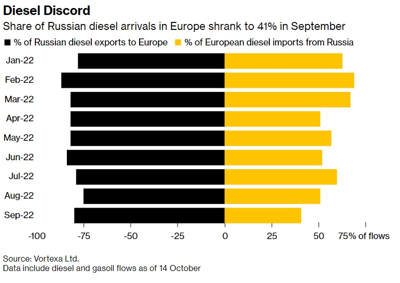 柴油市場(chǎng)混亂——今年9月,銷往歐洲的俄羅斯柴油份額降至41%