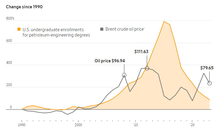 但根據(jù)美國(guó)教育部的數(shù)據(jù),在2016年至2021年期間,布倫特原油價(jià)格幾乎翻了一番,石油工程專業(yè)的畢業(yè)生人數(shù)卻減少了逾一半。