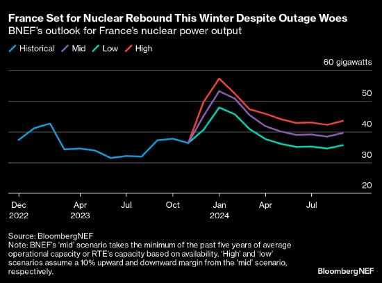 鑒于這些最新進(jìn)展,彭博新能源財(cái)經(jīng)將其對法國12月可用核電裝機(jī)容量的預(yù)測下調(diào)至45GW,較之前的預(yù)測低7%。不過,彭博新能源財(cái)經(jīng)仍然預(yù)測,法國在即將到來冬季的可用核電裝機(jī)容量平均為50GW,比去年同期增長23%。