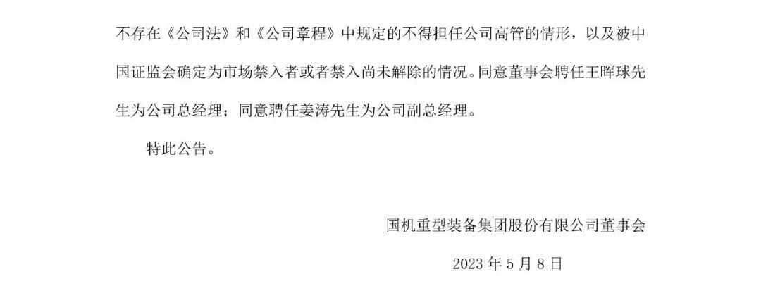 5月6日,國機(jī)重裝董事會審議通過了《關(guān)于聘任公司總經(jīng)理、副總經(jīng)理的議案》,同意聘任王暉球為公司總經(jīng)理;同意聘任姜濤為公司副總經(jīng)理。