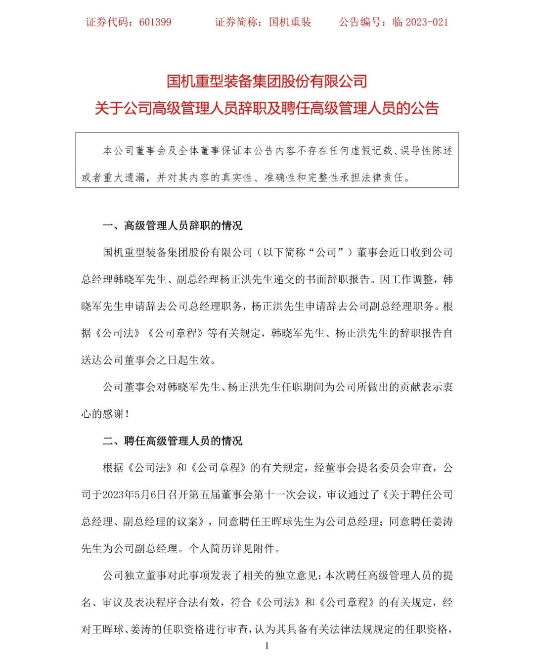 5月8日,國機(jī)重裝發(fā)布公告,董事會近日收到公司總經(jīng)理韓曉軍、副總經(jīng)理楊正洪遞交的書面辭職報告。因工作調(diào)整,韓曉軍申請辭去公司總經(jīng)理職務(wù),楊正洪申請辭去公司副總經(jīng)理職務(wù)。