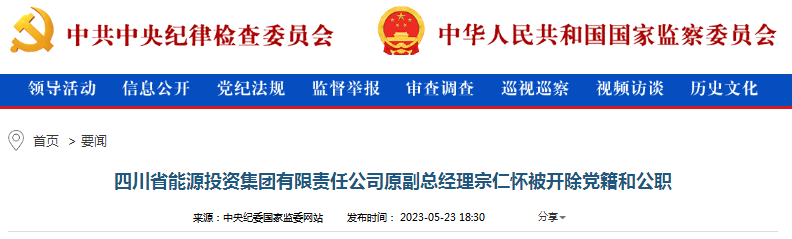 中央紀(jì)委國(guó)家監(jiān)委網(wǎng)站5月23日消息,據(jù)四川省紀(jì)委監(jiān)委消息:日前,經(jīng)四川省委批準(zhǔn),四川省紀(jì)委監(jiān)委對(duì)四川省能源投資集團(tuán)有限責(zé)任公司原副總經(jīng)理宗仁懷嚴(yán)重違紀(jì)違法問(wèn)題進(jìn)行了立案審查調(diào)查。