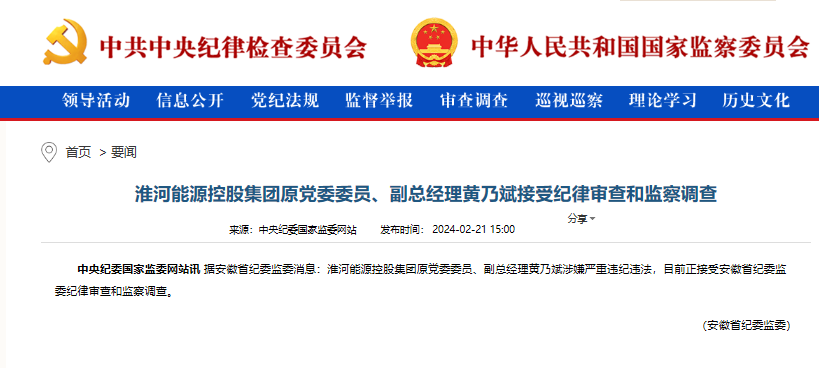 據(jù)安徽省紀委監(jiān)委消息:淮河能源控股集團原黨委委員、副總經(jīng)理黃乃斌涉嫌嚴重違紀違法,目前正接受安徽省紀委監(jiān)委紀律審查和監(jiān)察調(diào)查。