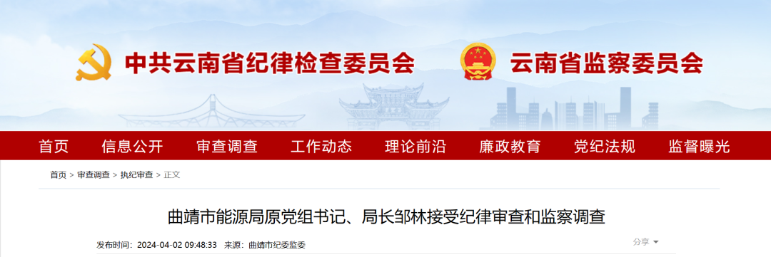 據(jù)曲靖市紀(jì)委監(jiān)委消息:曲靖市能源局原黨組書記、局長鄒林涉嫌嚴(yán)重違紀(jì)違法,主動投案,目前正接受曲靖市紀(jì)委監(jiān)委紀(jì)律審查和監(jiān)察調(diào)查。