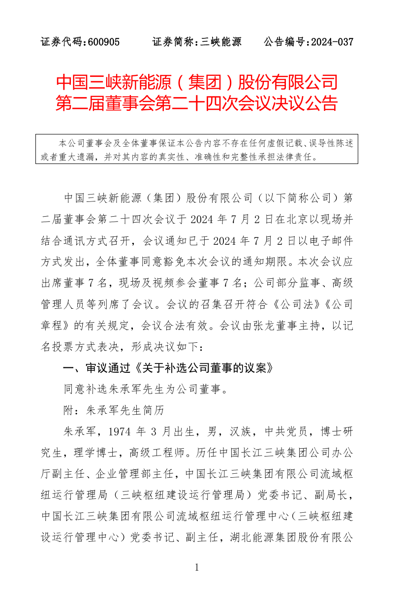 7月2日,三峽能源發(fā)布公告稱,公司第二屆董事會第二十四次會議于7月2日召開。會議審議通過《關(guān)于補(bǔ)選公司董事的議案》, 同意補(bǔ)選朱承軍先生為公司董事。