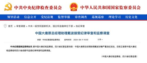 8月11日,中央紀(jì)委國(guó)家監(jiān)委網(wǎng)站發(fā)布消息,據(jù)中國(guó)大唐紀(jì)檢監(jiān)察組、四川省紀(jì)委監(jiān)委消息,中國(guó)大唐原總經(jīng)理助理戴波涉嫌嚴(yán)重違紀(jì)違法,目前正接受中國(guó)大唐紀(jì)檢監(jiān)察組和四川省成都市監(jiān)委紀(jì)律審查和監(jiān)察調(diào)查。