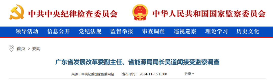 中央紀委國家監(jiān)委網站11月15日消息, 據(jù)廣東省紀委監(jiān)委消息:廣東省發(fā)展改革委副主任、省能源局局長吳道聞涉嫌嚴重違法,目前正接受廣東省監(jiān)委監(jiān)察調查。