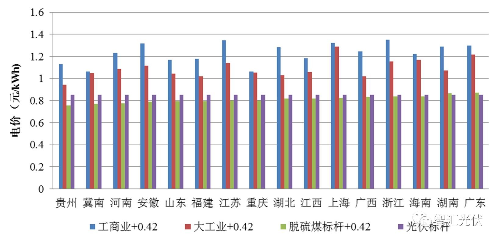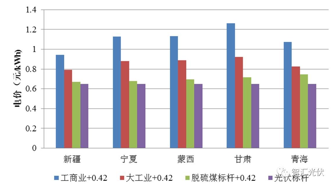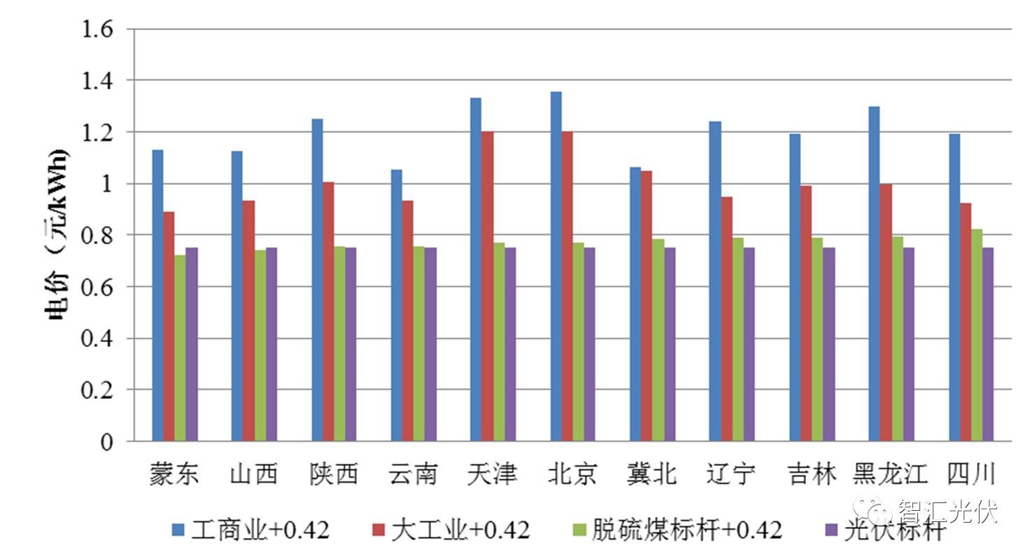 可以看出: “工商業(yè)+0.42”比0.65元/kWh高0.29~0.61元/kWh “大工業(yè)+0.42”比0.65元/kWh高0.14~0.27元/kWh 脫硫煤+0.42”比0.65元/kWh高0.02~0.095元/kWh 即在Ⅰ 類資源區(qū),無(wú)論是在工商業(yè)屋頂,還是大工業(yè)屋頂,“自發(fā)自用電價(jià)”、“余電上網(wǎng)電價(jià)“均高于當(dāng)?shù)氐摹叭~上網(wǎng)”標(biāo)桿電價(jià)0.65元/kWh。
