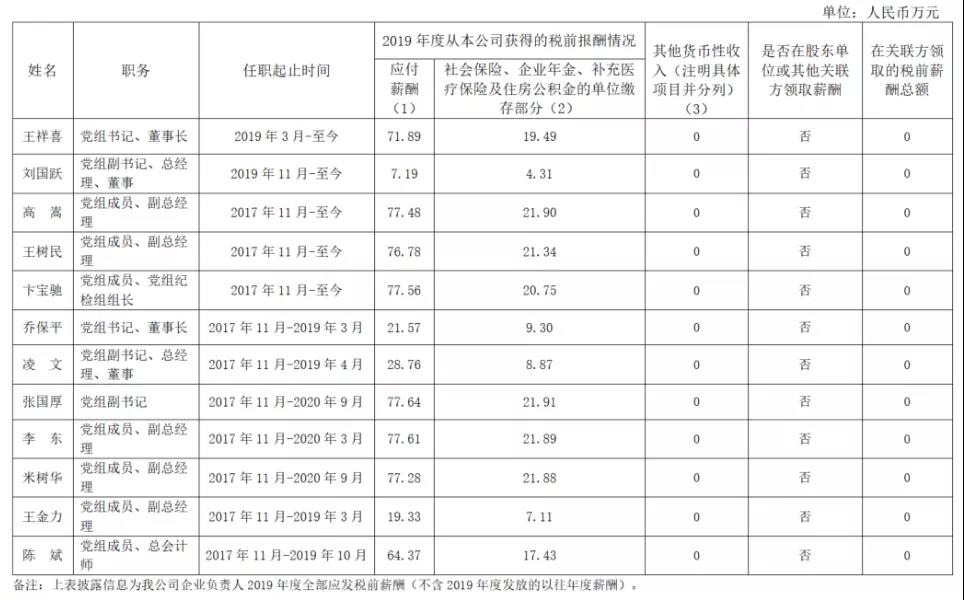 國家能源集團2019年度薪酬情況