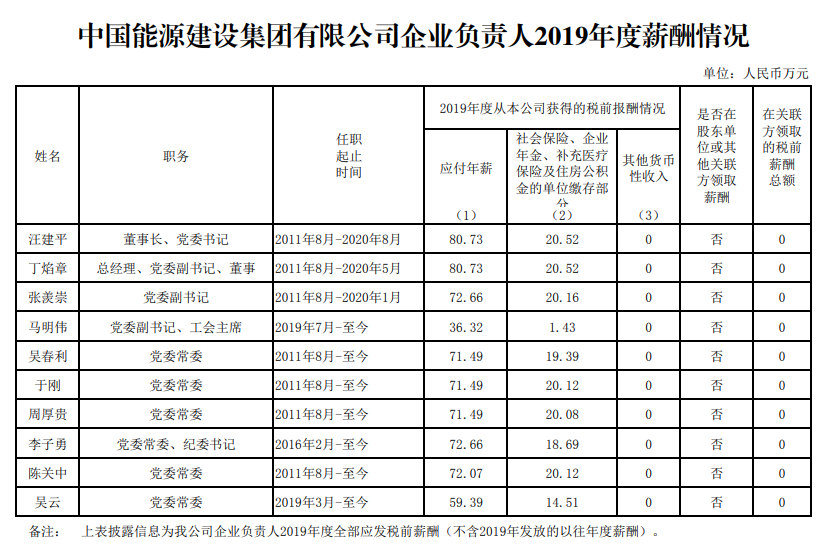 中國電力建設(shè)集團有限公司企業(yè)負責人2019年度薪酬情況