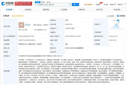 天眼查App顯示,一米八海洋科技(浙江)有限公司的法定代表人為鄧中華,注冊資本1.1億人民幣,經(jīng)營范圍包括水產(chǎn)養(yǎng)殖、食品銷售、水產(chǎn)品冷凍加工、輸電供電、海上風電相關系統(tǒng)研發(fā)、儲能技術服務等。