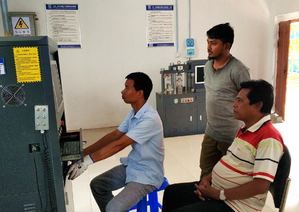 項目試驗室建設(shè)引進了國內(nèi)項目比較常用的萬能試驗機、壓力試驗機、水泥抗壓抗折一體機、電動擊實儀、EV2試驗儀、洛氏硬度計、扭矩試驗儀、螺栓抗滑試驗儀等40臺套主要試驗儀器,多數(shù)是由電腦控制,屬于先進設(shè)備。此后,項目試驗室主任陳立根成了大家的“中國師傅”,帶領(lǐng)16名孟籍試驗員一起學(xué)習(xí)研究業(yè)主招標文件和技術(shù)規(guī)格書,手把手教授使用各種試驗儀器設(shè)備,帶領(lǐng)大家一起開展路基填料、混凝土配比試拌、鋼筋試驗等。“他毫無保留地把自己掌握的試驗操作規(guī)程都教給了我們。”然森很慶幸自己擁有這樣一位“中國師傅”。