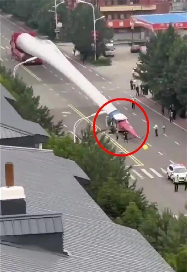 現(xiàn)場(chǎng)視頻顯示,一輛運(yùn)輸風(fēng)力發(fā)電機(jī)葉片的貨車停在路上,一輛面包車被葉片刺穿,面包車內(nèi)有人被困,民警和救援人員已到場(chǎng)處置。