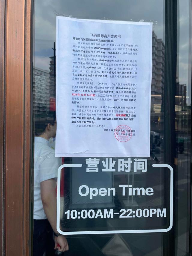 不過(guò),在該商場(chǎng)門口、電梯口等多處地方都貼上了告示,上面寫(xiě)著:自2024年7月起,鴻成物業(yè)無(wú)法在供電合同所約定繳付期限內(nèi)正常支付電費(fèi)。截至2024年10月8日,鴻成物業(yè)已累計(jì)欠費(fèi)288.29萬(wàn)元、違約金13.16萬(wàn)元,合計(jì)301.45萬(wàn)元。若鴻成物業(yè)于2024年10月13日24時(shí)前仍無(wú)法結(jié)清欠費(fèi),國(guó)網(wǎng)上海市南供電公司不得不自2024年10月14日起,對(duì)零陵路899號(hào)中止供電。