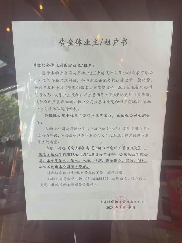 值得注意的是,鴻成物業(yè)與飛洲文旅此前已經(jīng)存在經(jīng)濟(jì)糾紛。記者辦公樓下看到,鴻成物業(yè)7月19日發(fā)布了一份“告全體業(yè)主/租戶書(shū)”,上面寫(xiě)著,鴻成物業(yè)與飛洲文旅之間存在欠款糾紛,如飛洲文旅拖欠物業(yè)費(fèi)、能耗費(fèi),并拒絕支付相關(guān)費(fèi)用,鴻成物業(yè)將進(jìn)行依法維權(quán)。