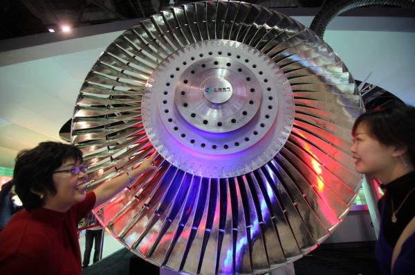 2009年10月4日,觀眾在北京展覽館觀看具有世界先進(jìn)水平的百萬千瓦超超臨界發(fā)電機(jī)組中的金屬葉片。