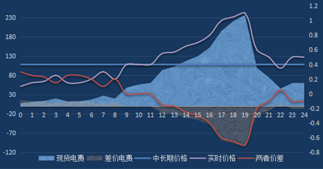 500千伏響布一、二線(xiàn)與500千伏坤德一、二線(xiàn)組成了“響布雙(送響沙灣)+坤德雙(送春坤山)”斷面,斷面輸送最大功率是260萬(wàn)千瓦,并不能夠支撐大烏海區(qū)域全部的外送需求,這就造成了蒙西電網(wǎng)在整體緊平衡(與全國(guó)情況相同缺乏煤電投資)的情況下東部緊張、西部寬松的供求形勢(shì)。電力現(xiàn)貨市場(chǎng)運(yùn)行后,供需情況自然就反映為現(xiàn)貨市場(chǎng)價(jià)格降低,大烏海區(qū)域部分時(shí)間各電廠現(xiàn)貨節(jié)點(diǎn)電價(jià)較低,這也符合市場(chǎng)的基本規(guī)律。加之電力市場(chǎng)建設(shè)初期國(guó)家更重視保護(hù)用戶(hù)的權(quán)益,因此各試點(diǎn)均將參考結(jié)算點(diǎn)選擇在用戶(hù)側(cè)參考結(jié)算點(diǎn)(由電源承受風(fēng)險(xiǎn)),同時(shí)為了使不同地區(qū)用戶(hù)之間的價(jià)格差距不至于太大,往往不按照用戶(hù)所在節(jié)點(diǎn)電價(jià)結(jié)算,而是為全體用戶(hù)選擇了同一個(gè)參考結(jié)算點(diǎn),這樣的做法實(shí)際上要求電源通過(guò)差價(jià)合約為用戶(hù)保價(jià),并且犧牲了電力現(xiàn)貨市場(chǎng)優(yōu)化用戶(hù)側(cè)資源的部分能力。如圖3所示,在部分時(shí)間內(nèi),阻塞斷面內(nèi)的電源在承受較低現(xiàn)貨價(jià)格的同時(shí),還要向參考結(jié)算點(diǎn)價(jià)格高于合同價(jià)的用戶(hù)支付價(jià)差電費(fèi),極端情況下,電源現(xiàn)貨電費(fèi)(藍(lán)色面積)甚至小于價(jià)差電費(fèi)(灰色面積),最終形成了負(fù)結(jié)算電費(fèi)(紅色面積),當(dāng)然這種情況在大烏海區(qū)域出現(xiàn)的不多,更多的表現(xiàn)為收入降低。