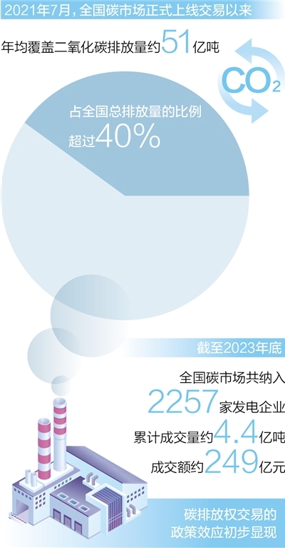 2021年7月全國(guó)碳市場(chǎng)正式上線交易以來(lái),運(yùn)行整體平穩(wěn),年均覆蓋二氧化碳排放量約51億噸,占全國(guó)總排放量的比例超過(guò)40%。截至2023年底,全國(guó)碳市場(chǎng)共納入2257家發(fā)電企業(yè),累計(jì)成交量約4.4億噸,成交額約249億元,碳排放權(quán)交易的政策效應(yīng)初步顯現(xiàn)。